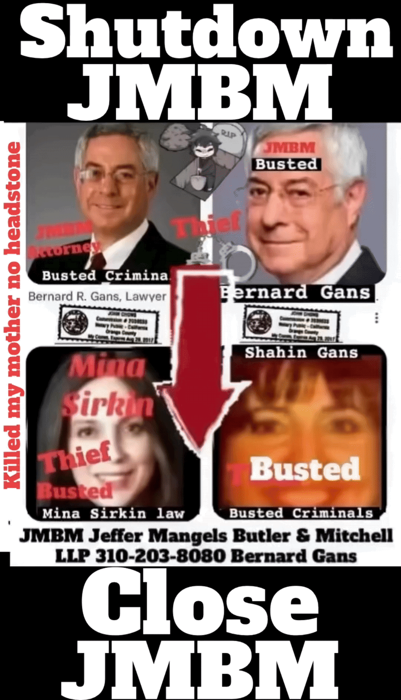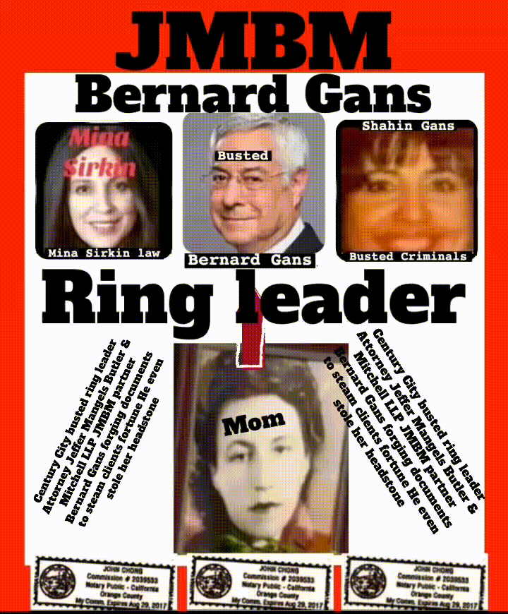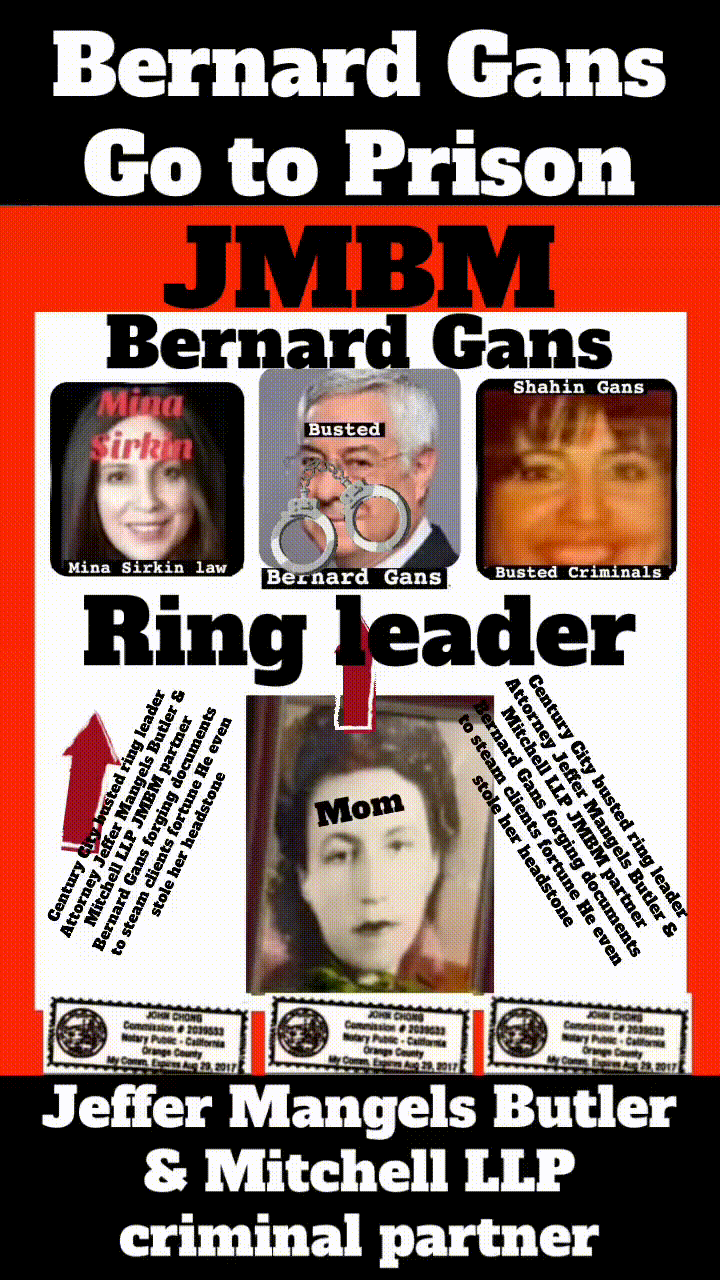 Bad Faith Bernard Reginald Gans # 57068 - jmbm California Business Lawyers Articles | Jeffer Mangels Butler & Mitchel LLP (JMBM) 1900 Avenue of the Stars, 7th Fl Los Angeles, CA 90067 310.203.8080 #58420 Luigi Bernard R. Gans - Articles | Jeffer Mangels Butler & Mitchel LLP California Business Lawyers Jeffer Mangels Butler & Mitchell LLP partner Bernard gans engaging in criminal acts forging illegal documents. GMBM attorney Bernard Gans patent lawyer is a criminal Jeffer Mangels Butler and Mitchell LLP jmbm lawyer Articles | bernard r. gans