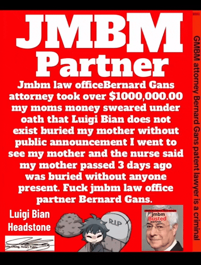 Suing JMBM partner $500,000,000,000.00 Busted criminal attorneys Jeffer Mangels Butler & Mitchell LLP lawyer Bernard Reginald Gans #57068 Bernard Gans Mina Sirkin law group JMBM killed my mom to get her fortune. Suing JMBM partner $500,000,000,000.00 Busted criminal attorneys Jeffer Mangels Butler & Mitchell LLP lawyer Bernard Reginald Gans #57068 Bernard Gans Mina Sirkin law group JMBM killed my mom to get her fortune..